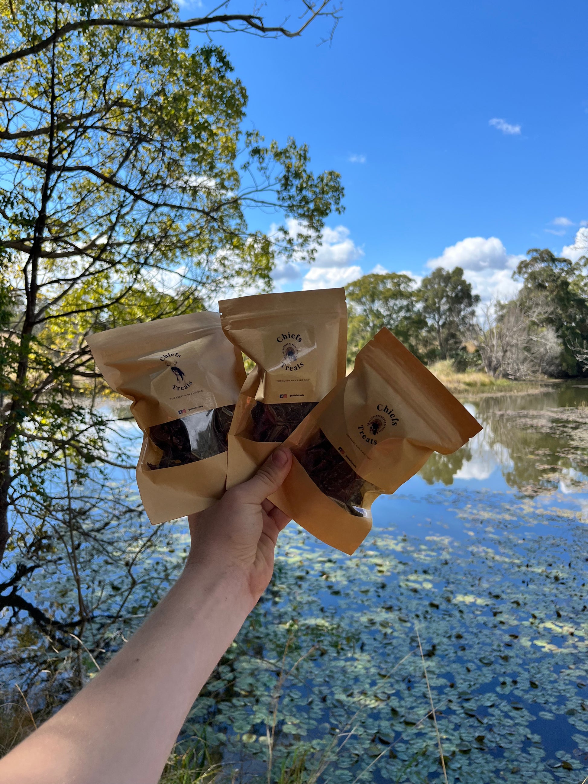 Chiefs Treats new 50g Variety bundle. In this bundle you will receive all 3 packs of chiefs treats. one 50g venison pack one beef 50g pack and one 50g pack of offal treats.